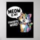 Este gráfico encantador apresenta um gato de desenho animado feliz com um único pelo bloqueado por cor em tons azuis, laranja, amarelo e roxo, esportando uma gravata de arco pontilhada por polca festiva e um pequeno sino. Uma bolha de fala ao lado do gato diz enfaticamente "MEOW É MINHA PALAVRA FAVORITA", com o resto do texto, "PALAVRA FAVORITA", exibido corajosamente abaixo. O design é colocado sobre um fundo preto sólido. Download digital apenas para uso pessoal.