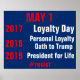 Texto branco e vermelho sobre fundo azul: 1 de maio de 2017: Dia da Lealdade 2018 Juramento de Lealdade Pessoal a Trump 2019 Presidente da Vida #resistir