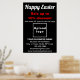 Poster personalizável com vendas de Páscoa feriado, seu nome comercial e outras informações. Poster que você pode usar como material de marketing para atrair mais clientes. Personalize e use-o para convencer mais clientes a comprar de seus produtos ou clientes para gostar de seus serviços neste feriado de Páscoa. As cores e formas design são textos brancos e vermelhos sobre fundo preto e forma retangular de formato de retrato. O conteúdo são textos de Felz pascoa, textos de venda, desconto percentual que você oferecerá, datas de venda, seu nome comercial, logotipo, endereço, número de telefone, e-mail e site ou sua página de mídia social. Verifique a aparência após carregar o logotipo e digitar textos. Se a aparência lhe agrada, você pode colocar seu pedido agora. Se você precisar redimensionar e mover o logotipo e os textos para o ajustado neste poster ou em outro tamanho, forma e estilo apropriados que você escolherá, mude na ferramenta design. Você também pode fazer outras alterações na ferramenta design de acordo com a aparência deste poster, que você prefere, como alterar a cor do fundo, a cor da fonte e o estilo da fonte. Felz pascoa! Desejando mais vendas neste feriado.