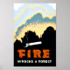 Poster para a prevenção de incêndios florestais, mostrando um cigarro em chamas e um incêndio florestal. Um dos grandes produtos temáticos da arte safra da PhoenixRetro.
