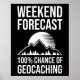 Previsão do Fim de Semana - 100% de Chance de Geocaching. Este cúmplice engraçado é excelente para homens geocaquedistas, mulheres, meninas, meninos, adolescentes e crianças que adoram ir caminhar ao ar livre e ir ao tesouro caçando por uma geocache escondida. Se o seu hobby é caminhar na floresta e usar um mapa de gps para ajudá-lo a encontrar o tesouro oculto, ou você gosta de criar e esconder você mesmo os geocaches, então este design é para você!