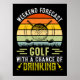 Esta ilustração lúdica apresenta um pôr do sol listrado ao estilo retrô em tons quentes de laranja, amarelo e verde, colocado atrás de uma grande bola de golfe texturizada com dois tacos de golfe cruzados. A grama verde está representada abaixo da bola de golfe. O texto superior "PREVISÃO DE FIM DE SEMANA" é curvo acima do pôr do sol, enquanto "GOLF" é exibido de forma destacada no centro, com "COM UMA OPORTUNIDADE DE" abaixo dele. O texto inferior "BEBENDO" está em um amarelo vibrante, flanqueado por ícones pequenos da garrafa de cerveja, completando a humorística previsão para um fim de semana relaxado.