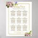 Este Gráfico de Casamento de 9 mesas tornará sua recepção de casamento bonita e ajudará seus convidados a encontrar suas mesas atribuídas. Apresenta texto dourado sobre fundo branco com uma borda de quadrados offset dourada e um belo buquê pastel de flores, incluindo rosas cor-de-rosa, lírios e orquídeas brancos, e hidrangea púrpura ou lavanda leve. O texto inclui o nome do casal e a data do casamento e é perfeitamente personalizável.