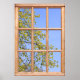 Primavera está no ar! A época é marcada pelas folhas verdes frescas que aparecem nas árvores. Admire esta vista em qualquer altura do ano com um poster falso de efeito de janela que inclui uma janela fotografada de madeira e a vista para além. Lá fora está um belo dia com um céu azul suave e novas folhas nos galhos.