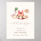 Celebra o chá de fraldas dos temas modernos e bonitos do chá de fraldas de aquarela, a ilustração da frente com ilustração aquática, vestido cor-de-rosa de flor da margarida, chapéu de palha, cesto de flores, sandália, brinquedo de coelho de coelho e caligrafia, texto "Oh bebê" sobre cor de fundo bege. A parte de trás é cor-de-rosa empoeirada. Perfeito para o verão, primavera, chá de fraldas. Personalize seu próprio texto.