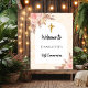 Ouro, impressão de mármore colorido de pêssego como fundo decorado com uma cruz de ouro, grama-pampas e flores cor-de-rosa escamoteadas e um quadro em forma de arco branco. Personalize e adicione um nome.
