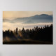 A névoa se senta sobre as colinas de Pieniny, Polônia. Os raios do sol se rompem e começa um novo dia.