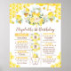 Poster de quadro de aniversário adorável, com adoráveis abelhões, pingando mel e um arranjo floral amarelo de verão