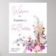Bem-vindos aos seus convidados com amor e estilo! A ilustração das flores modernas e elegantes primavera de verão, com bonito escritura de flores e pincéis selvagens, no primeiro aniversário com uma tipografia caligráfica moderna, com flores vermelhas, roxas, rosa, terracotta, é um sinal perfeito de boas-vindas para o seu aniversário de criança