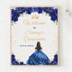 Esta elegante e glamourosa placa de boas-vindas da Quinceañera apresenta uma bela princesa com cabelo escuro num vestido azul escuro. O texto combina o script manuscrito e as fontes sans serif modernas para um aspecto elegante e sofisticado. Os arranjos florais e o confete de ouro criam a mistura perfeita de rústicos e quicos. Gráficos por www.etsy.com/uk/shop/SunflowerDayLove