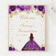 Esta elegante e glamourosa placa de boas-vindas da festa de aniversário Quinceañera apresenta uma bela princesa com cabelo escuro em um vestido de tiara e bola roxa. O texto combina o script manuscrito e as fontes sans serif modernas para um aspecto elegante e sofisticado. Os arranjos florais, borboletas e confete de ouro criam a mistura perfeita de rústicos e quicos. Gráficos por www.etsy.com/uk/shop/SunflowerDayLove