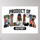 Produto do Poster de História Negra A imagem contém o texto "PRODUCT OF BLACK HISTORY" em letras negrito e pretas. A palavra "BLACK" é preenchida com imagens de figuras notáveis, cada letra contendo uma pessoa diferente. A imagem é interessante e relevante porque destaca as contribuições de vários indivíduos para a história negra, enfatizando o orgulho e o reconhecimento de suas conquistas. Este design poderoso e impressionante celebra a rica história e contribuições significativas de indivíduos negros.