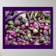 Produtos hortícolas roxos na mesa no mercado dos agricultores. Peles brilhantes refletem a luz. Os tons de rosado a púrpura escura permitem que os caules e folhas verdes fiquem em pop da imagem. O "quadro" de fundo é roxo escuro.