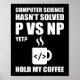 Este engraçado design de software de computação e desenvolvedor de web diz "a ciência da computação ainda não resolveu o problema do pnp? segure meu café". O design apresenta um café.