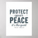 A distressed, vintage-style typographic poster design on a neutral light gray background. The text features a powerful message focused on mental well-being: "PROTECT your PEACE it's the quiet THAT HEALS." The design uses contrasting fonts—heavy, bold serifs for emphasis and elegant script for the secondary message, creating a strong, mindful aesthetic suitable for wall art or apparel.