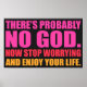 O poster diz: "Provavelmente não há deus, agora deixe de se preocupar e aproveite sua vida." em texto bem colorido em preto.