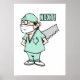 Um desenho animado de um cirurgião segurando uma grande mão viu atrás de suas costas gritando "PRÓXIMO!"