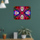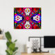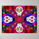Dia das calaveras mortas flutuando alegremente sobre fogos de artifício psicodélicos. Esta é a página de julho do nosso calendário do Dia dos Mortos de 2010.