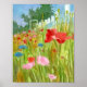 Um bonito poster com uma pintura floral de aquarela de um jardim de flores de papoila, vermelho e rosa, perto de uma cerca branca de picket, com uma perspectiva interessante e árvores verdes no fundo.