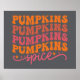 O design de "Pumpkins Spice" é uma representação divertida e vibrante do amado sabor de queda, picada de abóbora. O design apresenta de forma destacada a palavra "PUMPKINS" repetida cinco vezes em uma fonte em negrito, em estilo retrô, com bordas arredondadas, cada instância empilhada sobre a outra. A repetição enfatiza a palavra e torna a design instantaneamente reconhecível como uma celebração de todas as coisas abóbora.