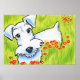 "Pure Schnauzer" retrata um Schnauzer branco parado em um campo cheio de flores de papoila. Ilustração a tinta e lápis colorida por Andie.
