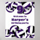 This volleyball themed birthday party welcome poster is fully customizable and features randomly arranged purple, black and white volleyballs, upon which you can personalize your custom message and the child's age, or customize the text to suit your event - by katz_d_zynes