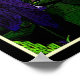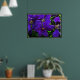 Púrpura e magenta e roxa e magenta clematis floresce esta poster. Os adoráveis estames de ouro são disparados pelas matizes violetas intensas e pistas de folhas verdes espiam por trás.