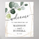 Aquarela eucalipto dourado, forma geométrica, com o roteiro "bem-vindo" e a tipografia clássica para o sinal de casamento.