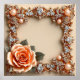 Quadro decorativo com dourado intrincado, com detalhes embelezados com diamantes espumantes e pérolas. Há uma bela rosa de pêssego com folhas verdes posicionadas no canto inferior esquerdo.
