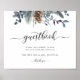 Sinal de livro de visitas elegante com a capacidade de alterar o texto para se adequar a qualquer evento. Exquisite design floral pintado à mão em aquarela no topo com folhagem e pinheiro em tons de azul, azul-marinho, sage, cinza e verde. Uso de detalhes de caligrafia moderna manuscrita e tipografia em bloco. Livro de visitas coordenado disponível. Parte da nossa coleção de casamento e eventos "Montanhas Azuis Rústicas".