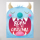 Decoração de quarto de berçário fofa para o seu filho! É uma ilustração fofa de um monstro azul com a boca bem aberta. O texto dentro da boca diz "nascido para ser original". Design de citação inspirador legal para o quarto dos meninos.