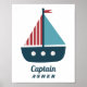 Lindo pôster para o quarto do seu menino ou berçário. Ilustração de um barco em tons de azul e vermelho com um texto personalizado na parte inferior que diz "capitão". Adicione o nome da sua criança na parte inferior.