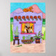 Estes quatro gatos curiosos estão sentados na janela enquadrada rosa-e-talavera e no telhado de uma adorável moradia ao estilo do Taos no sudoeste americano. Cactos de textura rica e plantas suculentas em potes coloridos de talavera acenam a casa, fornecendo um contraste bem-vindo à areia do deserto, onde um lagarto fica perto. Montanhas cor-de-rosa e lavanda, assim como verde, iluminam o fundo sob um céu azul brilhante e sem nuvens.