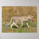Perfil africano Cheetah (Acinonyx jubatus) andando sobre o capim com carne na boca
