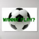 quer jogar poster de uma bola de futebol com "WANNA' PLAY?" atravessando.