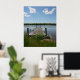 A weathered wooden dock stretches out across calm water beneath a bright blue sky in Michigan’s Upper Peninsula. Surrounded by forest and still water, this peaceful lakeside scene captures the quiet beauty of northern Michigan summers.