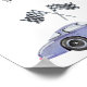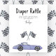 Cartão de convite para chá de fraldas do tema Race car com ilustrações de aquarela de um carro vintage roxo (violeta) e de preto - branco. "Corrida para um chá de fraldas."