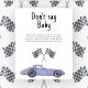 Cartão de convite para chá de fraldas do tema Race car com ilustrações de aquarela de um carro vintage roxo (violeta) e de preto - branco. "Corrida para um chá de fraldas."