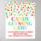 Candy adivinhando poster de sinal de jogo para chá de fraldas no padrão de confete arco-íris, perfeito para um bebê borrifo.