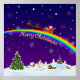 Bonita paisagem de neve na noite de Natal com árvores de Natal, casas, um boneco de neve, uma igreja, e Papai Noel voando sobre um arco-íris no céu noturno com flocos de neve.
