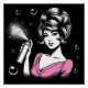 Uma na moda, à moda do médio-20, segura uma lata de spray de cabelo na mão direita. Seu cabelo volumoso, meticulosamente estirado, se destaca contra um fundo preto. As bolhas brancas flutuam ao seu redor, acrescentando à vibração lúdica, mas sofisticada. Esta trabalho de arte é uma homenagem ao glamour icônico de uma era passada.