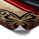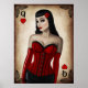 Estilo da rainha do design de corações com efeitos fortes. Apresenta uma ilustração de uma linda jovem, com cabelos longos e pretos, vestindo um espartilho vermelho.