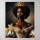 Esta poster apresenta a trabalho de arte de uma bela e elegante rainha de pele escura vestindo trajes reais intrincados e elaborados e uma tiara joalhada - estilo clássico de retrato de pintura a óleo com uma reviravolta moderna! Esta mulher espantosa é da diáspora africana. Ela tem cabelos curtos estilhaçados em cachos.