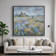 Artwork of a stroll through a garden on a rainy day. The scene features a lone figure under an umbrella, walking a winding dirt path toward a welcoming stone cottage. Surrounded by a meadow of swaying bluebells and wildflowers, the landscape is softened by the falling rain. The composition leads the eye along a curved path, past vibrant clusters of blue, purple, and yellow wildflowers, toward a solitary figure and a rustic stone cottage in the distance. The cool color palette of greys, indigos, and forest greens is balanced by the warmth of the path and subtle earth tones. Perfect for creating a cozy, introspective atmosphere in a reading nook, study, or bedroom