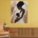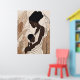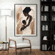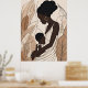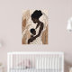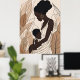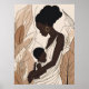 Uma representação suave, porém poderosa, de uma mãe segurando seu filho, ambos envoltos em tecidos macios e afeto. As linhas fluidas e tons terrosos suaves evocam calma e força, enquanto as folhas grandes que os cercam simbolizam proteção e beleza natural. Os brincos de argola dourados que ela usa adicionam um toque sutil de realeza, homenageando a cultura e a individualidade.