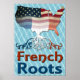 Um mapa dos EUA com as bandeiras da França e da América e o texto "Raízes Francesas" por baixo. Excelente para os americanos orgulhosos de sua ancestralidade francesa e para ex-pais.