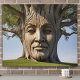 Árvore marrom com um rosto humano esculpido em seu tronco se posiciona de forma destacada em um poster de campo verde e luxuoso. Os ramos crescem a partir da cabeça, mostram crescimento, desenvolvimento, pensamento positivo ao longo do tempo.