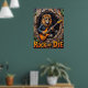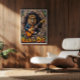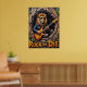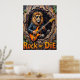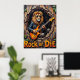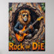 Este trabalho de arte convincente retrata um leão, olhando facilmente legal em óculos de sol e uma jaqueta de couro, colocando "estratos primitivos" em uma guitarra elétrica de dentro de uma árvore texturizada oca. Os elementos naturais da floresta subtilmente enquadram a cena, enquanto a proeminente mensagem "Rock or Die" reforça a energia bruta. O espesso e expressivo crio uma textura tangível, fazer a paixão do leão pela música realmente ressoa