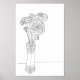Impressão de ilustração de buquê floral Ranunculus. Desenho simples de tinta preta (trabalho artístico original) de um buquê de flor ranúnculo elegante num pano de fundo de papel branco.