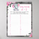 Atividade de jogos de chá de fraldas Elefante para Garota Floral - Cartão de Chá de fraldas para Bebê Animal com fundo de flores rosa-d'água e texto personalizável, jogo de bebês de animais A-Z.